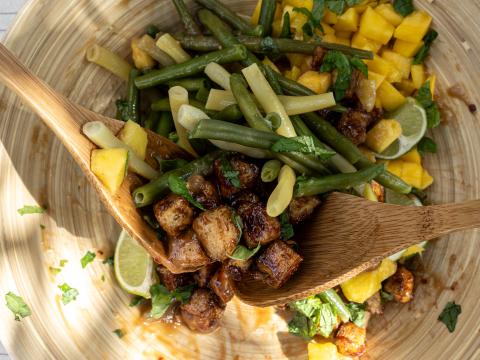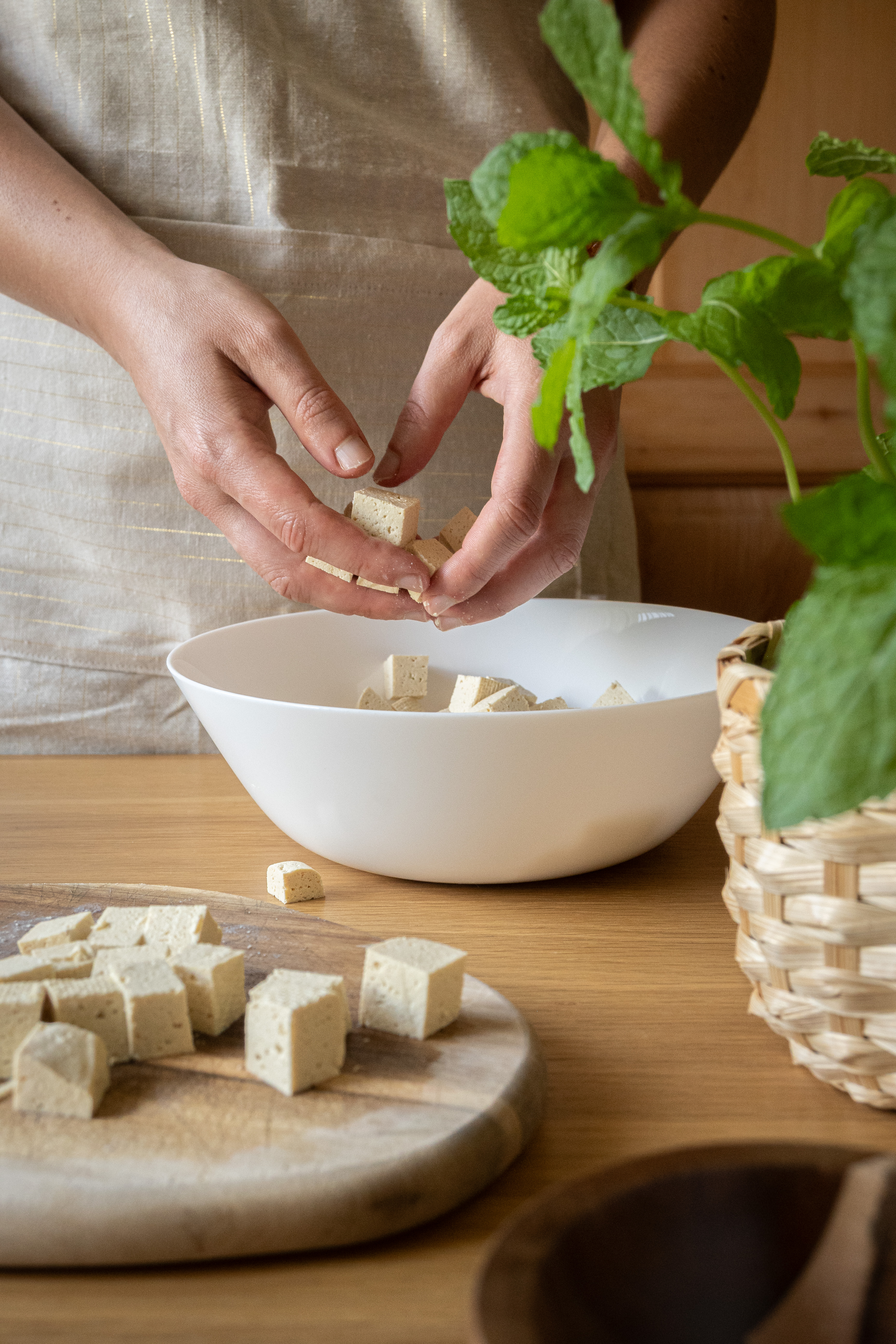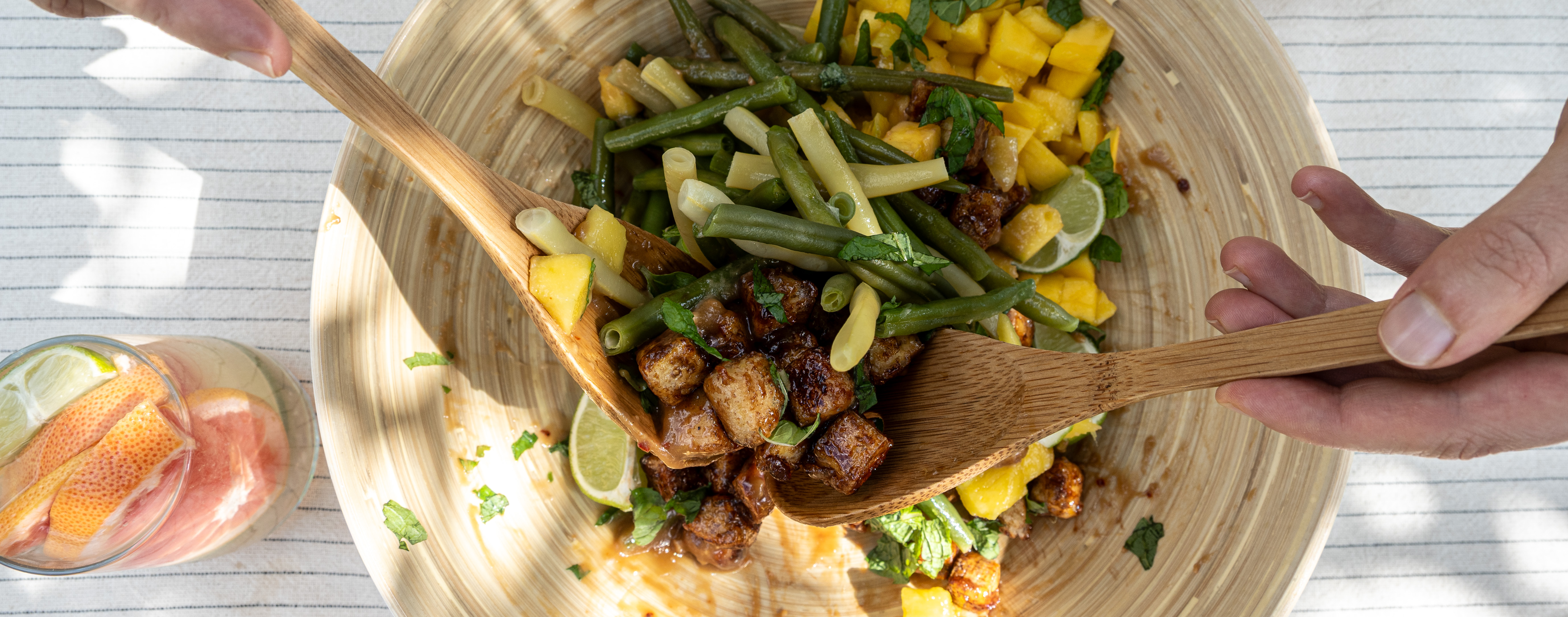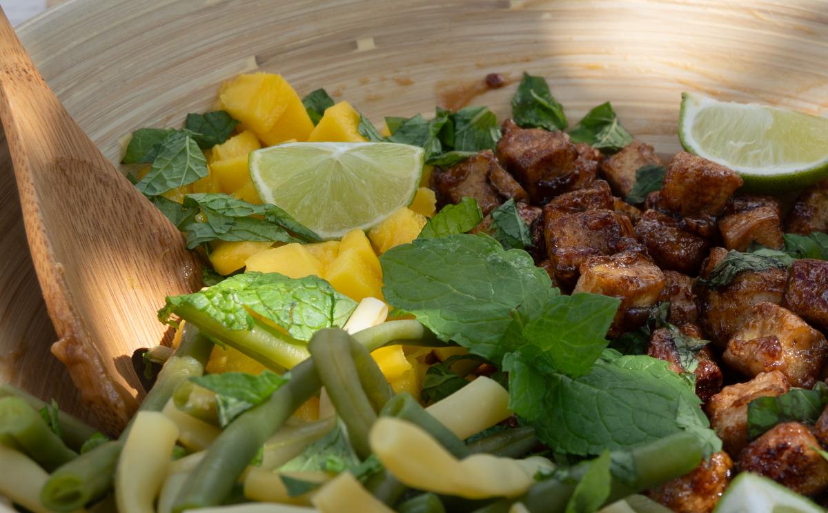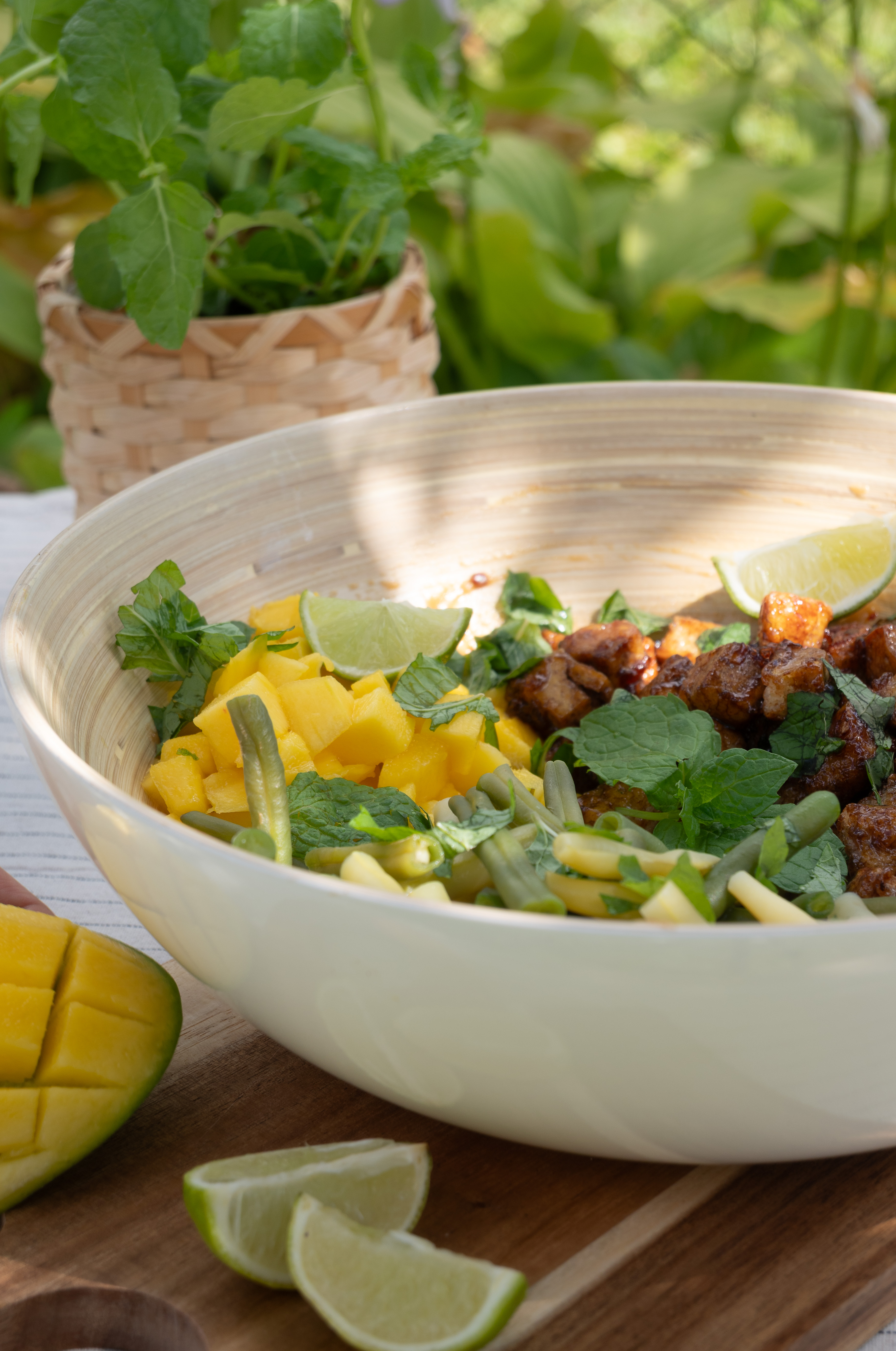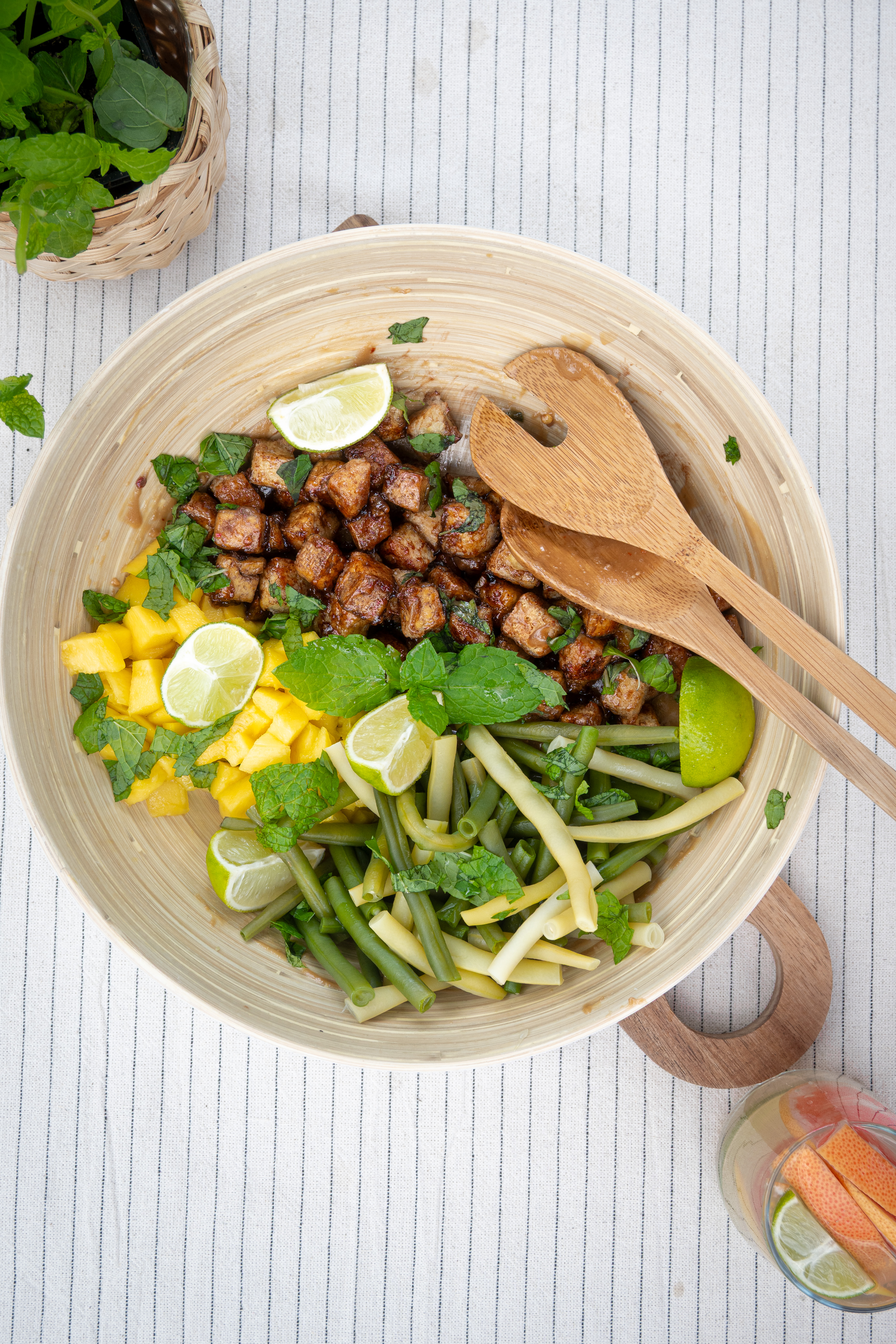 📍Łączenie – w dużej misce połącz fasolkę, mango, tofu i listki mięty. Polej dressingiem i delikatnie wymieszaj.