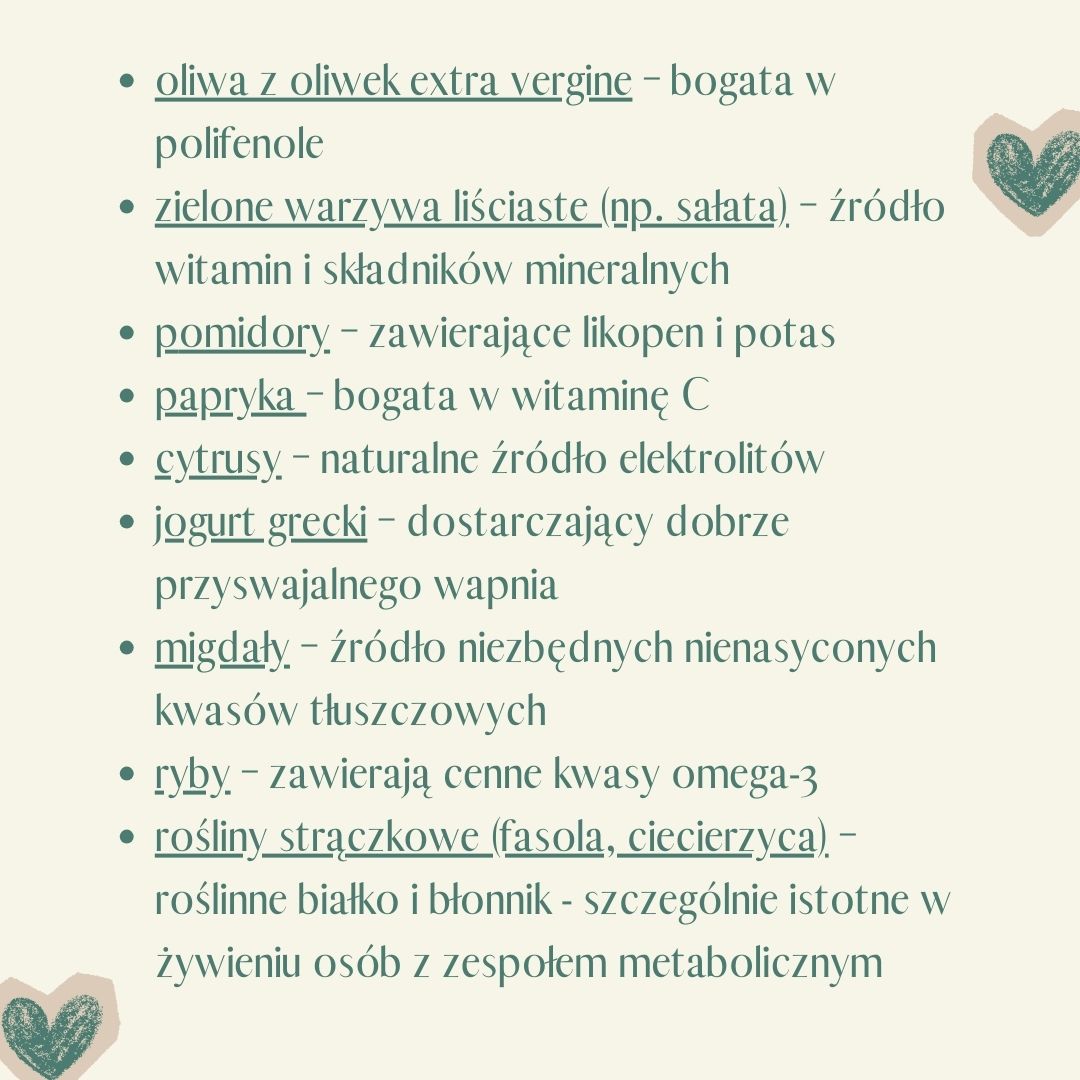 Na grafice zebra艂am kilka popularnych sk艂adnik贸w diety 艣r贸dziemnomorskiej i kr贸tko opisa艂am ich znaczenie w kontek艣cie prawid艂owego funkcjonowania uk艂adu sercowo-naczyniowego 鉂わ笍